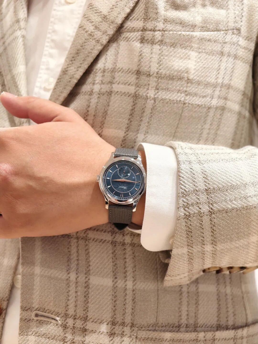 極簡的日期款,精鋼款藍灰漸變旭日紋盤看實物更有味道,彷彿走進一片“被迷霧籠罩的汝山谷森林”,靜謐、剋制、高級。38毫米的直徑配合僅8.4毫米的纖薄厚度,成爲日常通勤的最優解。