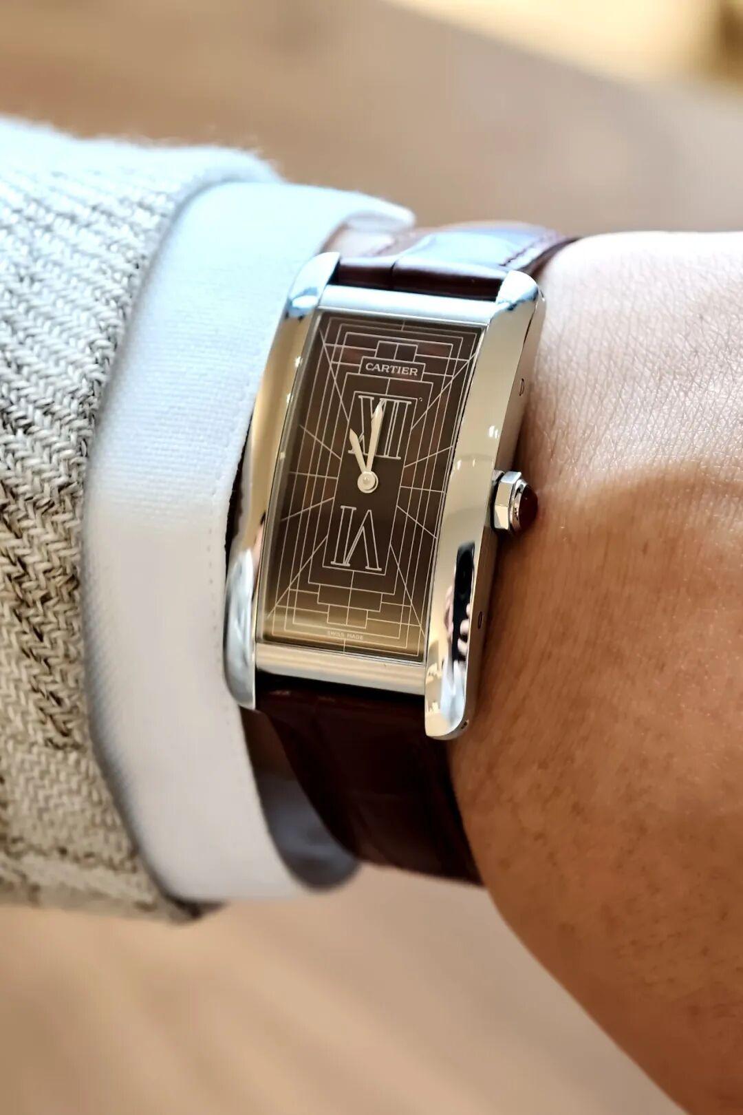 還有一塊造型看不膩的Tank Normale腕錶,寬錶殼搭配七鏈節鉑金錶帶,極簡高級。