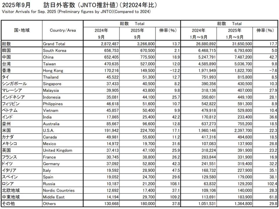 2025年前三季度訪問日本的外國遊客數據。圖源:日本政府觀光局