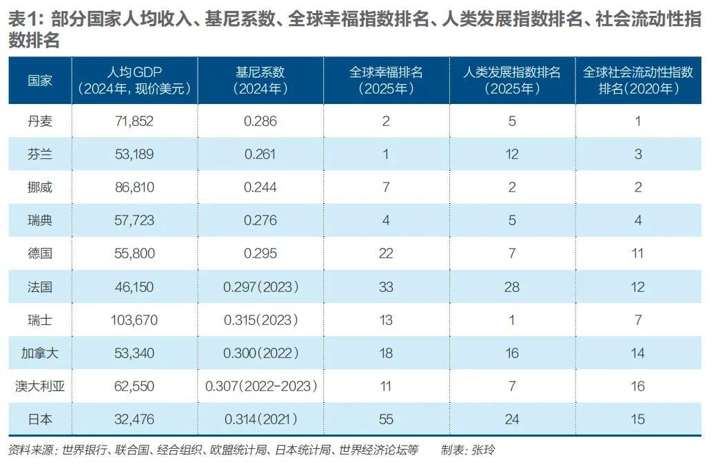 筆者在2021年9月6日《財經》雜誌上發表的《全球視野下的共同富裕:聚焦高品質包容性創富》一文中,提出實現共同富裕需要跨越三道坎:第一坎是跨越中等收入陷阱,邁入高收入經濟體行列(根據世界銀行2025年數據,全球共有87個高收入經濟體);第二道坎是從高收入經濟體進一步躋身發達經濟體(根據IMF 2025年數據,全球共有41個發達經濟體)。在41個發達經濟體中只有少數幾個國家實現了共同富裕,包括部分西歐國家(北歐四國、德國、法國、瑞士、盧森堡),以及澳大利亞、加拿大和日本等。其中,一些發達國家由於人口和地域規模比較小(如瑞士、盧森堡),並不具備追求富強的必要條件。