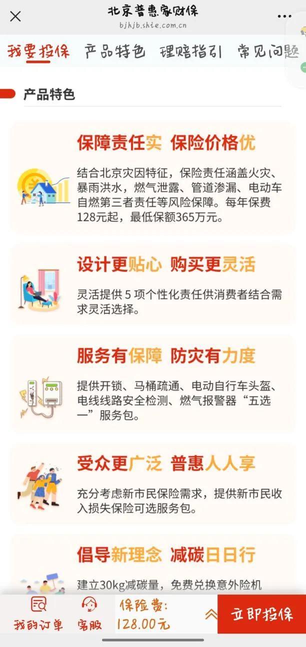 如北京近期正在推行的普惠家財保,由人保財險、太平洋產險、平安產險等九家保險公司共同承保。除了承擔因災害造成的財產損失,還提供開鎖、修馬桶、電線線路安全檢測等服務,價格爲128元/年。