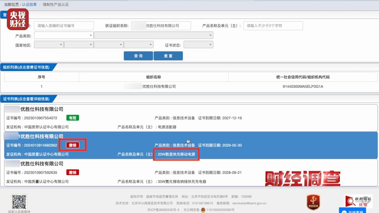 記者登錄公共服務平臺查詢發現,產品標註的優勝仕科技有限公司僅有的一張移動電源3C認證證書已處於撤銷狀態,充電寶型號也對不上,且產品機身的核心信息無中文,屬於禁止銷售的充電寶產品。