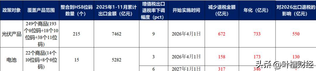 據興業證券的統計,對光伏行業而言,2026年企業將少獲得550億出口退稅;對電池行業來說,2026年退稅額將減少130億。