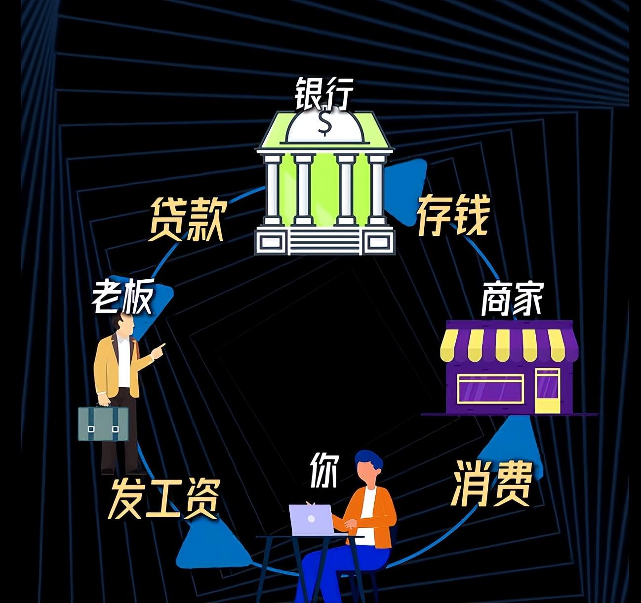 你的老闆向銀行借了10萬塊給你發工資,你拿着這筆錢去消費,商家收到你的錢之後,又把這筆錢存入銀行,如此這般,就形成了一次貨幣投放的完美閉環。反覆幾次後,這10萬元就像一枚石子投入水中,漣漪一圈圈擴散,通過銀行系統“存款-貸款-再存款”的循環,衍生出了一連串越來越大的數字。