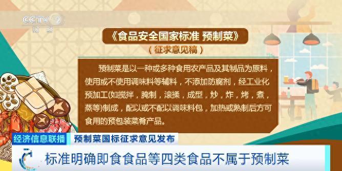 (央視財經《經濟信息聯播》)國家衛生健康委今天(2月6日)發佈了《食品安全國家標準 預製菜》(徵求意見稿),面向社會公開徵求意見,標準要求強化源頭和過程管理,重點從食品安全和營養健康方面對預製菜做出規定。預製菜到底包括哪些食品一直是大家關注的焦點,標準對預製菜的概念作了進一步細化明確,規定了四類食品不屬於預製菜,這四類都有其他相應的食品安全國家標準予以管理。
