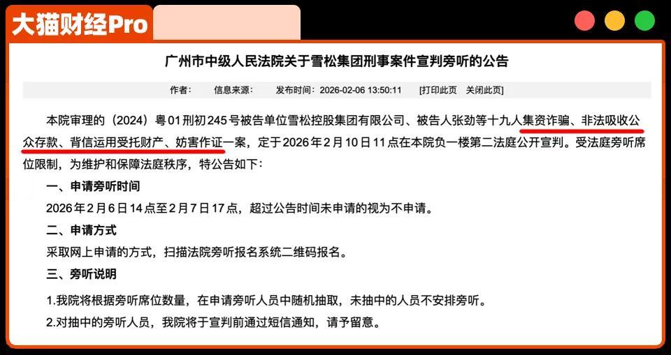 雪松控股的老闆張勁涉集資詐騙、非吸、背信運用受託財產、妨害作證等,根據法院的預告,判決將在2月10日下來。