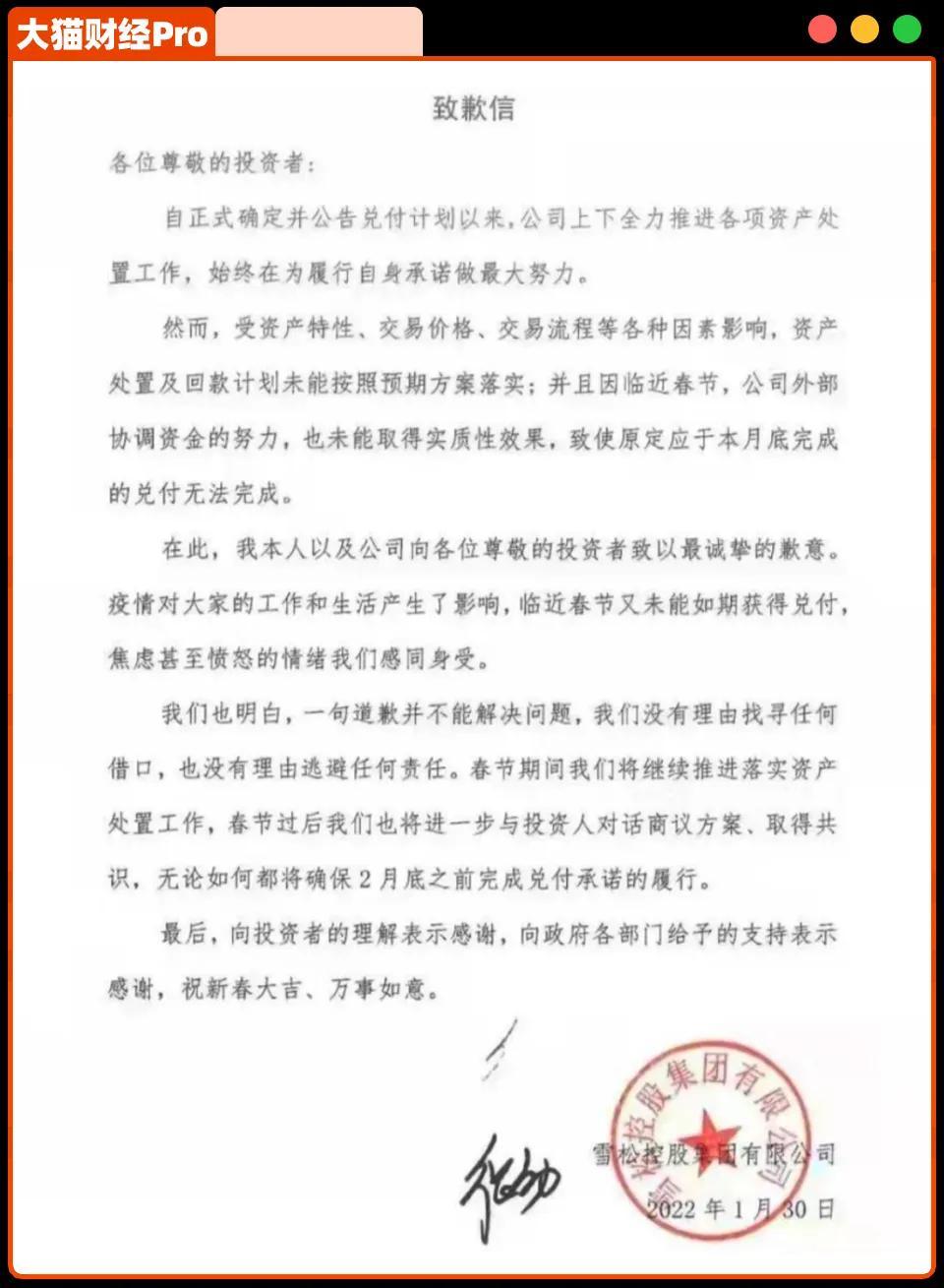 張老闆發了致歉信,官宣了理財產品暴雷,並稱春節後會與投資者商量兌付方案,他說他不會跑,“2022年我已經準備好了被限高、被追債”。