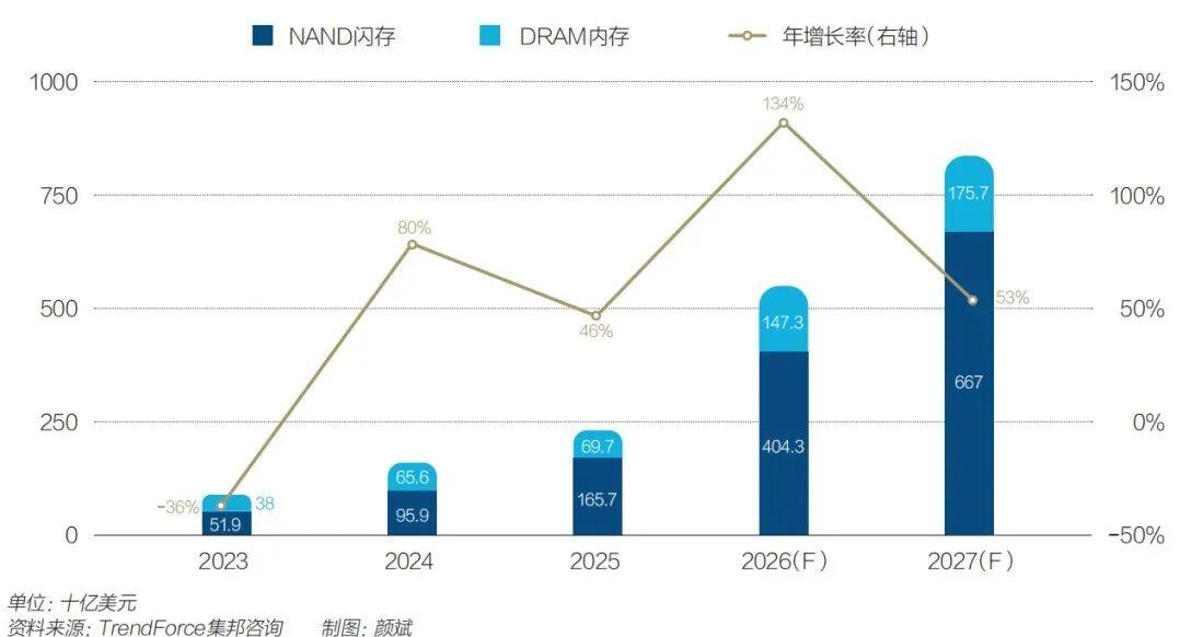 圖1:2023年-2027年DRAM內存與NAND閃存產值預估