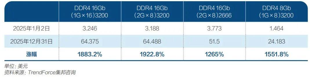 從2025年4月開始,DDR4現貨市場價格一路飆升,6月起更是出現16GB DDR4現貨價格反超DDR5的罕見倒掛。TrendForce集邦諮詢數據顯示,部分規格的DDR4單條價格在2025年年初不到3.2美元,2025年漲到64.5美元,漲幅高達1922.8%。