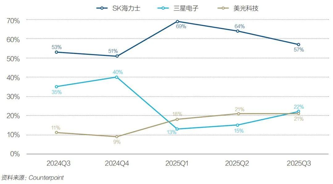圖2:2024年三季度至2025年三季度全球HBM市場份額(以收入計)