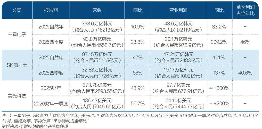 例如,三星2025年全年營收333.6萬億韓元、營業利潤43.6萬億韓元、淨利潤45.2萬億韓元,同比分別增長10.9%、33.2%、31.2%。其四季度業績表現尤爲亮眼,營收93.8萬億韓元,營業利潤20.1萬億韓元,同比增長209.2%,四季度營業利潤佔全年營業利潤的46.0%。