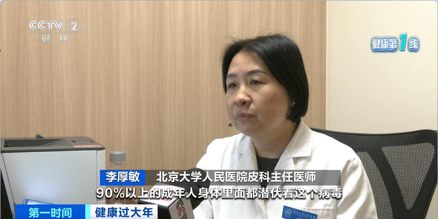 北京大學人民醫院皮科主任醫師 李厚敏:90%以上的成年人身體裏都潛伏着這種病毒,當我們免疫力下降到一定程度,免疫系統不能夠抑制病毒增殖的時候,就會得帶狀皰疹,約三分之一的成人在這一輩子中會得帶狀皰疹。