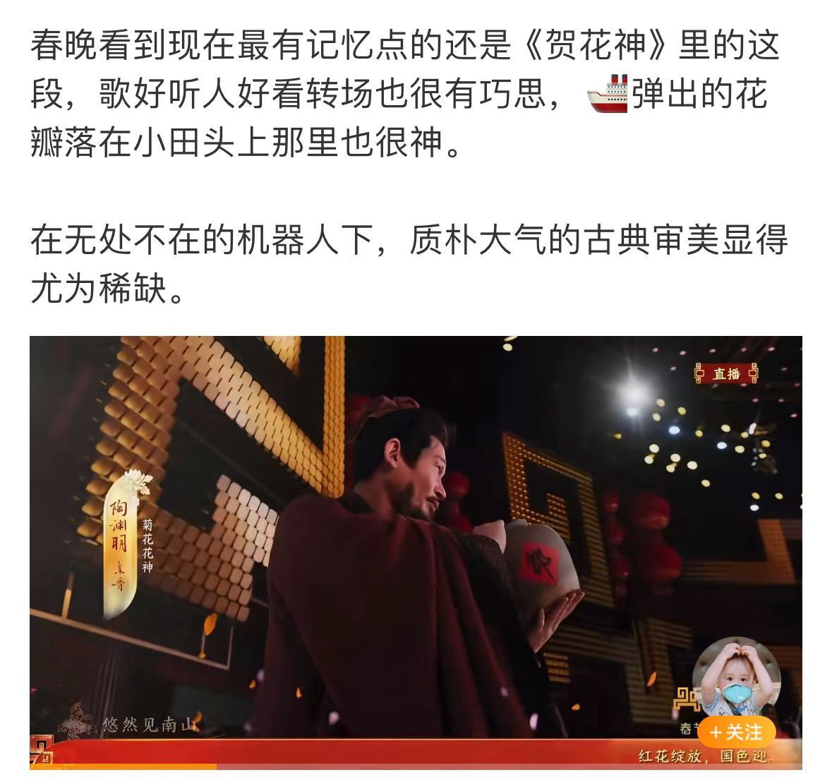 誠如所言,從陶淵明“採菊東籬下,悠然見南山”的菊之風骨,到周敦頤“出淤泥而不染”的蓮之君子品性……每一種花都被賦予了深厚的人格化寓意與情感寄託,讓沉澱於典籍詩詞中的文化意象,得以在億萬家庭團聚的夜晚“活”過來,完成了一次大規模、沉浸式的國民美育與文化尋根。