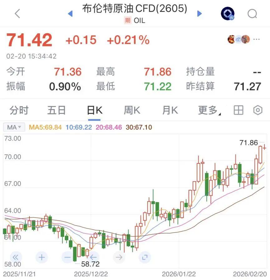 截至2月20日,布倫特原油年內漲幅已達17%,超過黃金的15%。