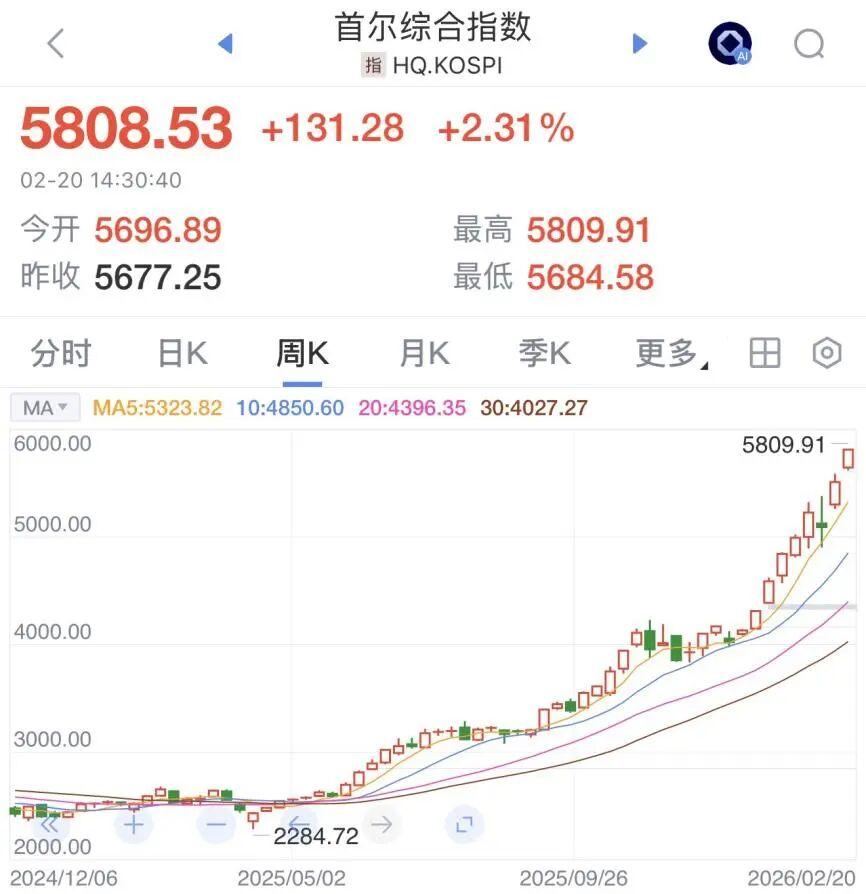 在亞洲,韓國股市繼續高歌猛進,在AI硬件公司的帶領下,持續創出歷史新高。截至2月20日,首爾綜合指數已超過5800點,年內漲幅接近35%,雄踞全球榜首。