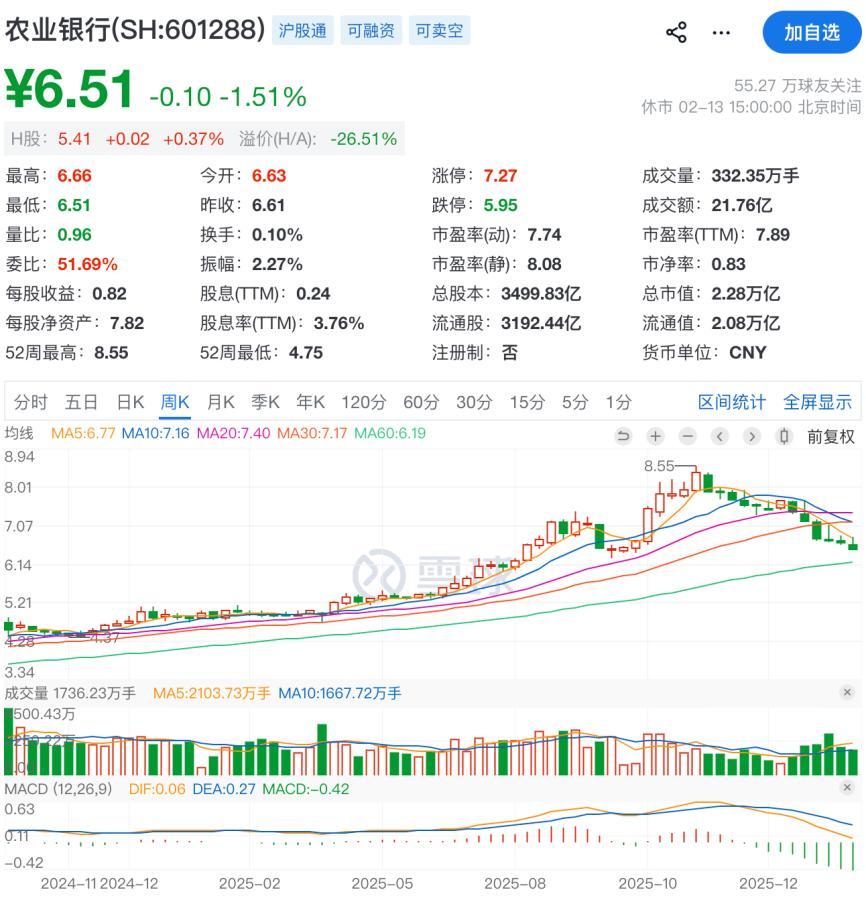 以龍頭農業銀行爲例,2025年11月見頂以來持續走弱,截至2月12日,股價已經從高位回落超過20%,距離年線僅一步之遙。