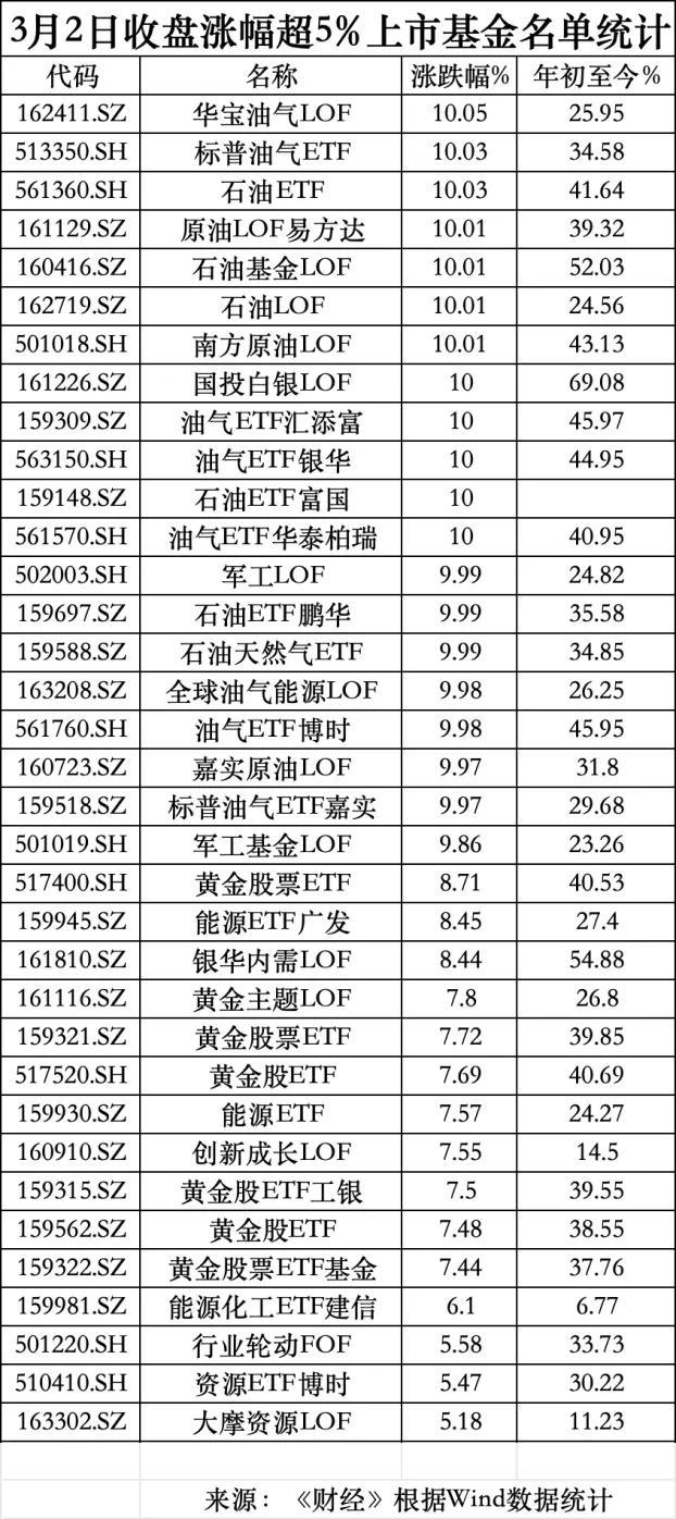 國際油價的走強直接傳導至國內相關資產端。A股市場上,油氣板塊掀起漲停潮,市值較大的中國石油、中國海油、中國石化歷史性集體漲停。基金方面,Wind數據顯示,2月24日,南方原油LOF、原油LOF易方達漲停。3月2日開盤後,原油基金再度大漲,原油LOF易方達、南方原油LOF、標普油氣ETF上午漲幅均超8%。截至收盤,多達20只上市基金漲幅超9%,12只基金漲停。