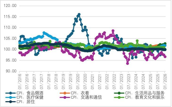 如圖2所示,自2024年11月至2026年1月,中國CPI同比增速已經連續15個月低於核心CPI同比增速,這說明食品與能源價格是拉低中國CPI同比增速的重要原因。在過去20年內,CPI同比增速持續低於核心CPI同比增速的現象並不多見,主要發生在2017年以及2023年至今。中國CPI商品籃由食品菸酒、衣着、生活用品與服務、醫療保健、交通和通訊、教育文化與娛樂、居住、其他用品與服務等八大類商品構成,權重分別爲29.5%、5.4%、5.5%、8.9%、14.3%、11.4%、22.1%與2.9%。從圖3中可以看出,交通與通訊細項以及食品菸酒細項的負增長是近年來拉低中國CPI同比增速的主要因素。由於交通與通訊細項與能源價格高度相關,因此圖3的結論與圖2是相互印證的。另一方面,近期生活用品與服務、衣着和醫療保健細項是拉高中國CPI同比增速的主要因素。