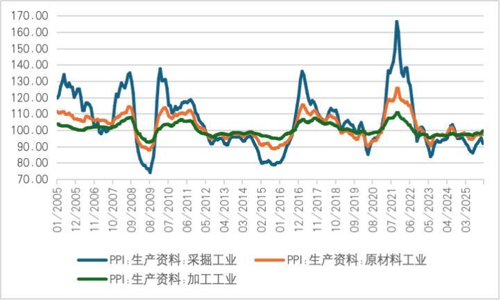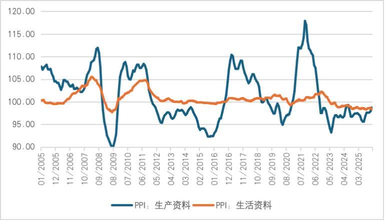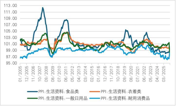如圖5所示,從歷史上來看,PPI生產資料細項同比增速下降通常是PPI同比增速下降的主要原因,本次也不例外。不過,與2012年至2016年期間相比,本次PPI生活資料細項同比增速出現了更爲明顯的負增長。在2025年下半年,反內卷政策的實施使得PPI生產資料細項同比增速明顯反彈。