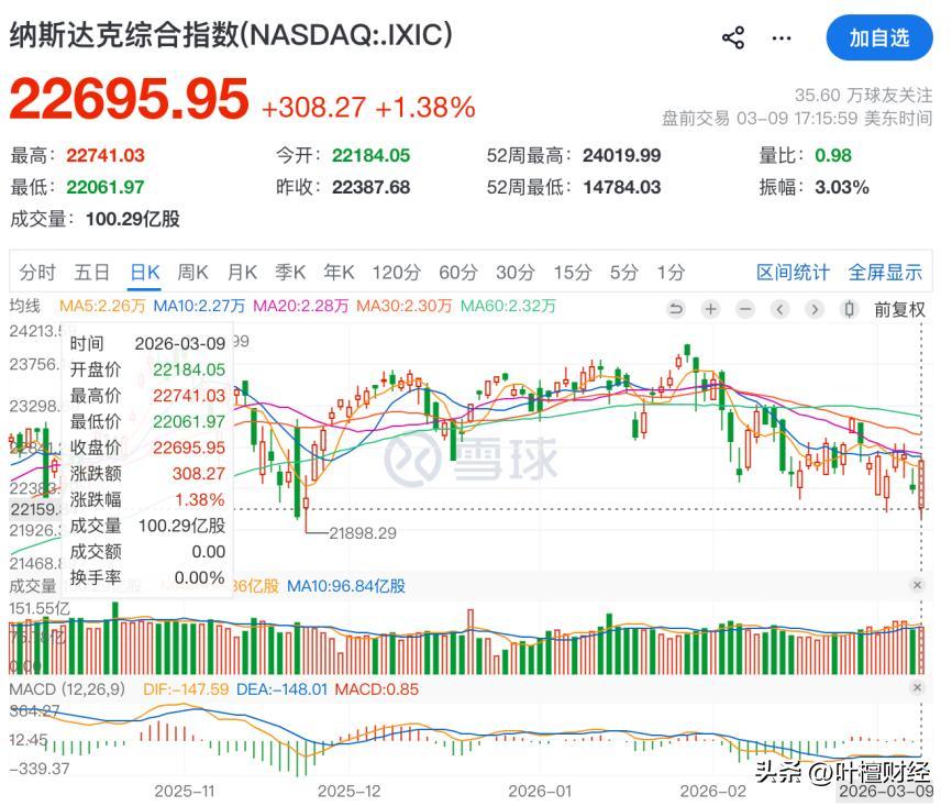 3月9日,老川橫跳之前,美國股市恰逢關鍵點位。以納斯達克爲例,從2025年9月以來,只要跌到22000點,老川就會“救市”,屢試不爽。
