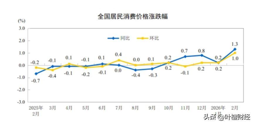 3月9日,國家統計局公佈了2026年2月份的通脹情況,結果顯示,2月份中國CPI同比增長1.3%,創近三年來新高。