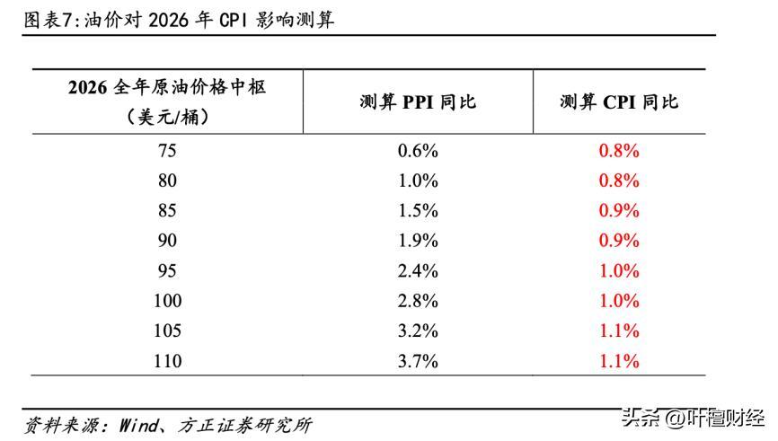 方正證券則表示,2026年,即便油價的中樞價格在110美元,中國CPI也就被拉動到1.1%,當然PPI會高一些,接近4%。