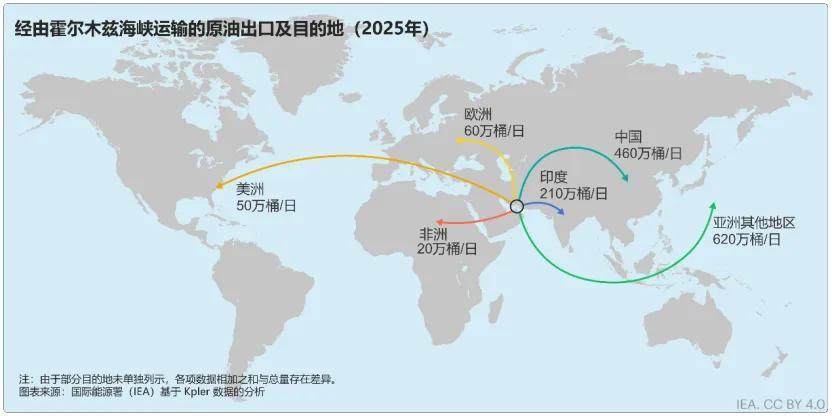 根據IEA統計,2025年有將近1500萬桶/日的原油經由霍爾木茲海峽運輸,約佔全球原油貿易量的34%,其中大部分出口目的地爲亞洲。中國和印度合計接收了其中44%的原油出口。IEA成員國有約29%的進口原油經由霍爾木茲海峽,其中日本和韓國尤其依賴經由該海峽運輸的石油。該地區約有60萬桶/日的原油(僅佔4%)輸送至歐洲。