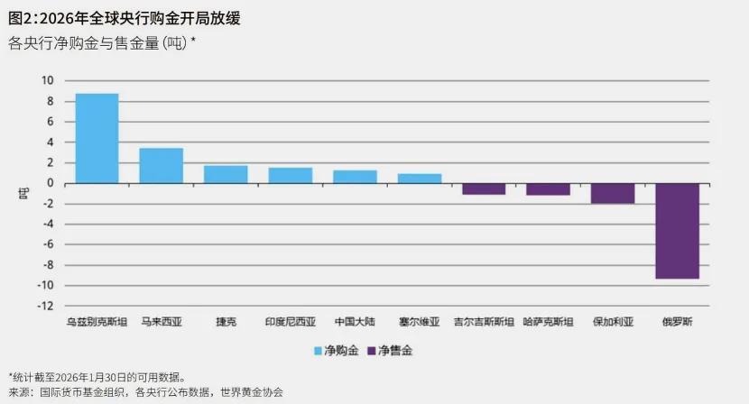 世界黃金協會的統計數據顯示,全球央行的黃金購買勢頭在2026年初有所放緩。1月全球央行的淨購買總量爲5噸,僅爲2025年平均月需求量的不到20%