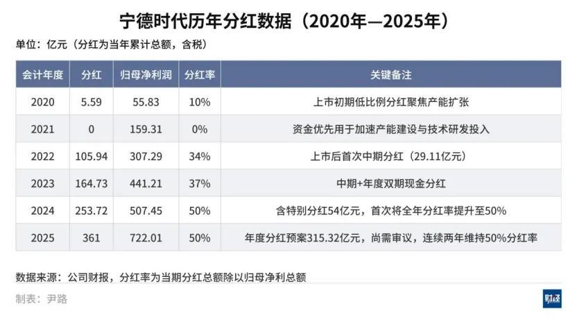 從2020年的5.59億元穩步提升至2023年的164.73億元,再到2024年、2025年分別達到253.72億元和361億元,寧德時代的分紅規模大幅增長。同時,其分紅佔歸母淨利潤的比例也連續兩年穩定在50%,在業務規模擴張後,財務策略正逐漸向穩健經營與注重回報投資者的模式過渡。