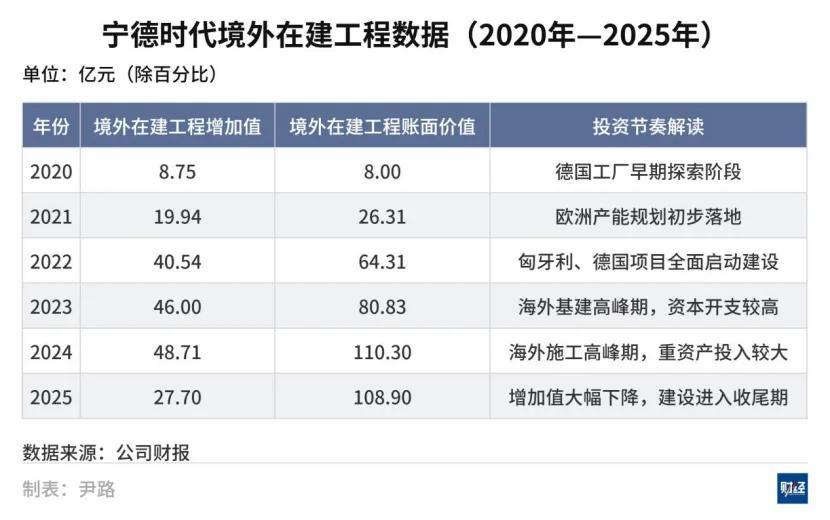 在維持國內市場較高份額的基礎上,全球化產能佈局是寧德時代後續增長的關鍵。2025年年報披露的在建工程數據顯示,公司海外建設投資規模有所回落,變化主要源於一批海外項目接近建設尾聲,逐步由建設階段轉入投產階段。