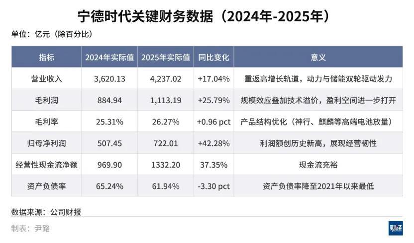 寧德時代2025年的營收達4237億元,同比增長17.04%;淨利潤爲722億元,同比增長42.28%。在高基數之上,歸母淨利潤和扣非淨利潤的增速均高於營收增速,表明公司的盈利能力提升。