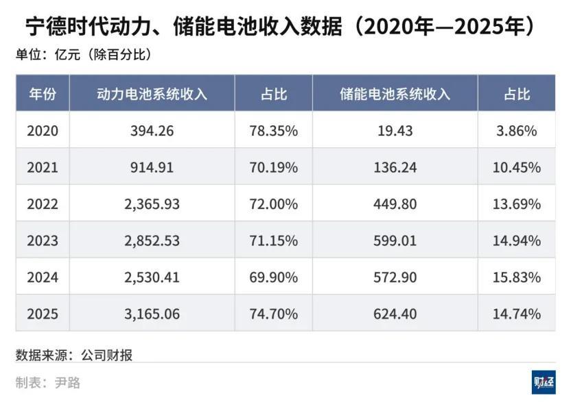 這一增長由動力電池與儲能電池業務共同驅動。2025年其動力電池系統收入達3165.06億元,佔比74.7%,儲能電池系統收入達624.4億元,佔比14.7%。動力電池的收入佔比相較2024年有明顯回升,在電池企業普遍出現“動力降,儲能增”的趨勢時,寧德時代的動力電池業務仍保持較快增長,主要來自高端產品及海外市場需求。