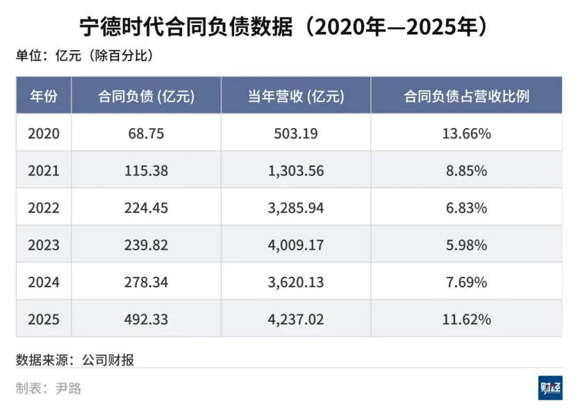 2025年,寧德時代的合同負債金額達到492.33億元,相較於2024年的278.34億元,同比增長76.88%。同時,合同負債佔當年營業收入的比例,從此前年度的6%—7%左右上升至11.62%。而上一次佔比達到兩位數是2020年,次年電池市場即出現供不應求。