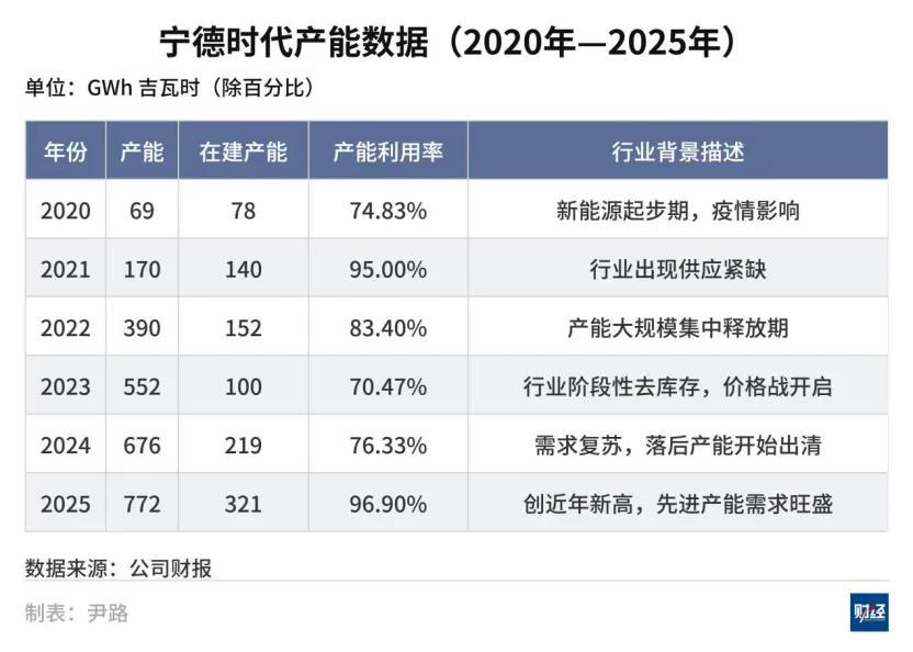 2021年電池嚴重供不應求,車企在電池企業門口排隊等着提貨,當年寧德時代的產能利用率爲95%。2025年,在寧德時代總產能擴大至772GWh(吉瓦時),爲2021年4.5倍的基礎上,產能利用率上升至96.9%,創下歷史新高,產線基本處於滿負荷運轉狀態。