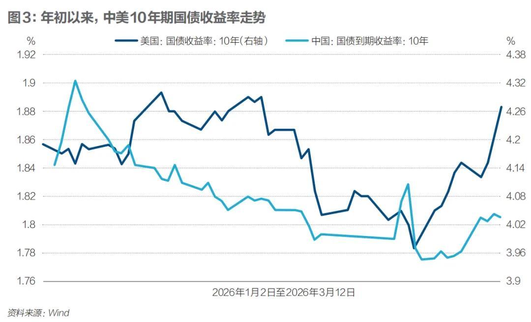 “美以軍事打擊伊朗對中國債市更多是外部擾動,而非主導變量。”林成煒總結稱,近期中國10年期國債收益率上行,主要受兩方面影響:一是油價上漲帶動上游價格抬升,市場上修通脹預期;二是出口數據明顯超預期,提升了對基本面韌性的判斷,壓制了利率下行空間。“但由於國內內需和通脹總體仍偏弱,且貨幣政策仍有寬鬆空間,所以中債調整幅度明顯小於美債。整體來看,當前決定中國利率的核心,仍是國內基本面、財政發力節奏、寬鬆政策預期和資金面。”