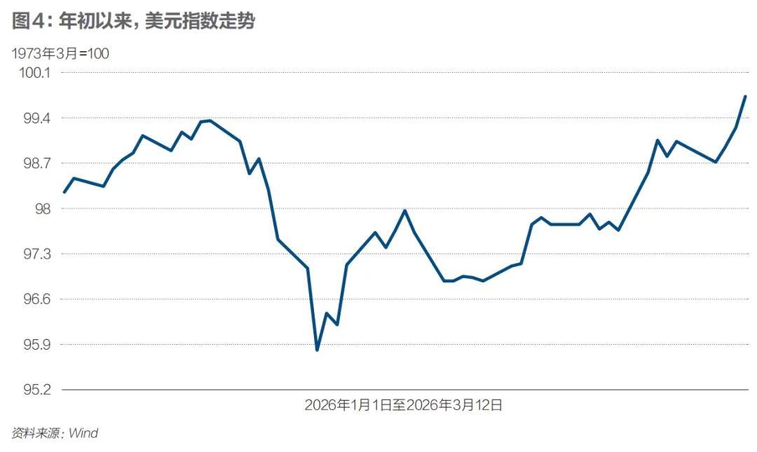 匯市方面,避險情緒推升美元,亞洲貨幣普遍承壓。美元指數震盪上行,在3月13日升至99.795,爲2025年11月28日以來的最高水平。日元、韓元、新加坡元等貨幣近期均出現不同程度貶值。