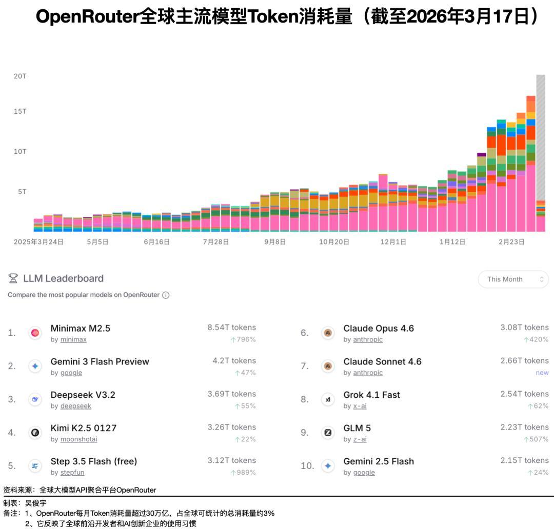 尤其是2026年以來,中國基礎模型在全球開發者中變得流行。MiniMax、DeepSeek、月之暗面的Token(詞元)調用量輪番衝進OpenRouter全球前三。OpenRouter 3月17日數據顯示,MiniMax M2.5、DeepSeek V3.2、月之暗面的Kimi K2.5的Token消耗量分別位居全球第一、第三、第四。 OpenRouter聚合了全球300多個主流模型,佔全球可統計Token總消耗量約3%。它反映了前沿開發者和創業企業的偏好。
