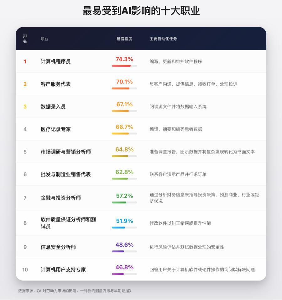 上述數據表明,受到AI衝擊最大的是知識型“白領”崗位。程序員、數據分析員、客服代表等職業因工作高度流程化、標準化,成爲最易被影響的羣體。這揭示了一個核心趨勢:重複性認知任務正被高效替代,而人類的獨特價值將更集中於需要創造力、複雜決策和情感交互的高階領域。