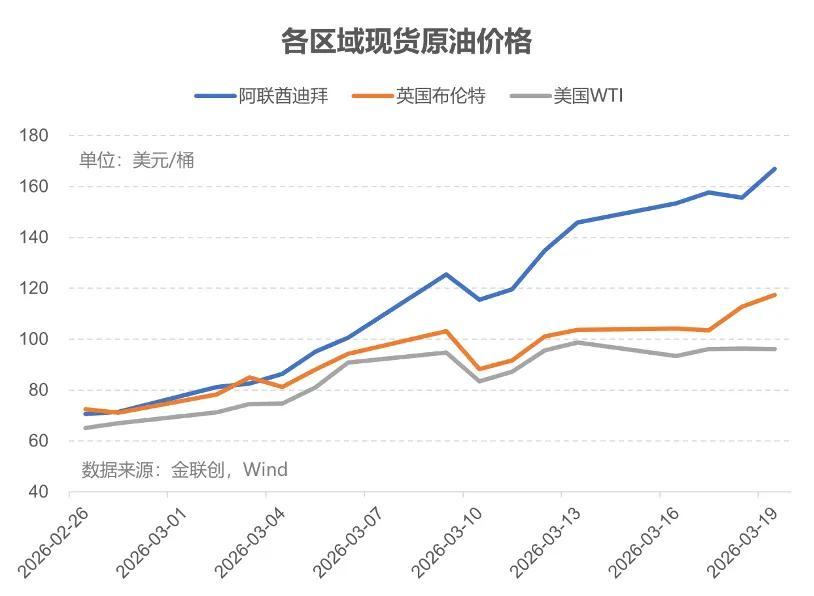 由於衝突導致霍爾木茲海峽運輸停擺、貿易量銳減,中東原油基準價格升至歷史新高,成爲全球最的原油。3月19日,迪拜原油現貨價格已達166.97美元/桶,相比布倫特原油的溢價已接近50美元/桶。
