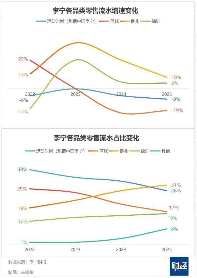 財報顯示,2022年以來,李寧運動時尚品類零售流水持續負增長,流水的整體佔比從2022年的39%下降至28%;籃球品類在2021年、2022年高速增長後,2023年起下滑明顯加快,流水佔比從2022年的29%下滑至17%。