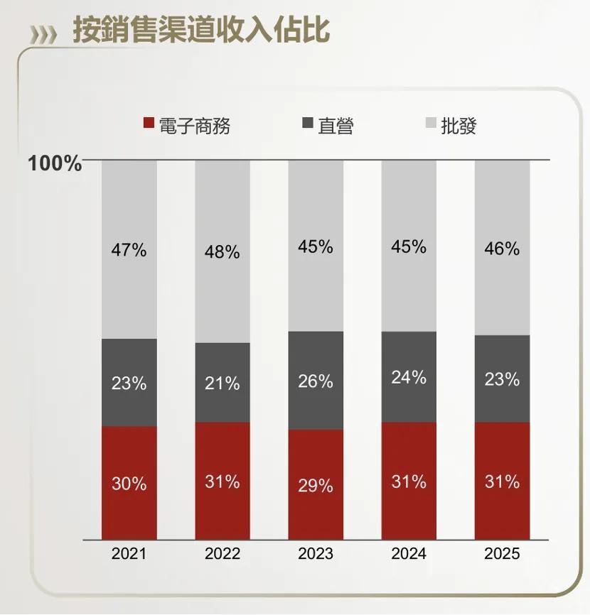 2025年仍然是對線下銷售不太友好的一年。這一年李寧直營渠道收入下降4%,對總營收的貢獻下滑1個百分點至23%。