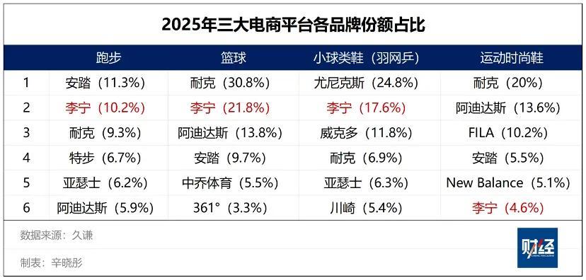 在跑步賽道競爭日趨激烈的格局下,李寧跑鞋品類在三大電商平臺的份額從2022年的9.3%上升至2025年的10.2%,排名從第四上漲到第二位。