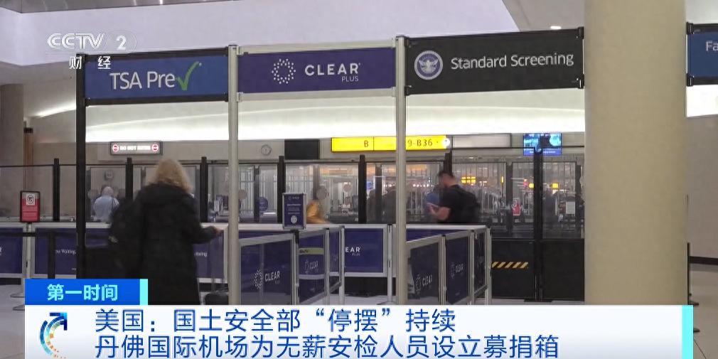 (央視財經《第一時間》)美國國土安全部“停擺”僵局已持續約五週時間,國會兩黨仍未就相關撥款達成協議。國土安全部下屬的運輸安全管理局運作受到嚴重影響,機場安檢員們只能在無薪狀況下繼續工作。爲幫助這些面臨經濟壓力的安檢人員,丹佛國際機場在航站樓內設立了募捐箱。