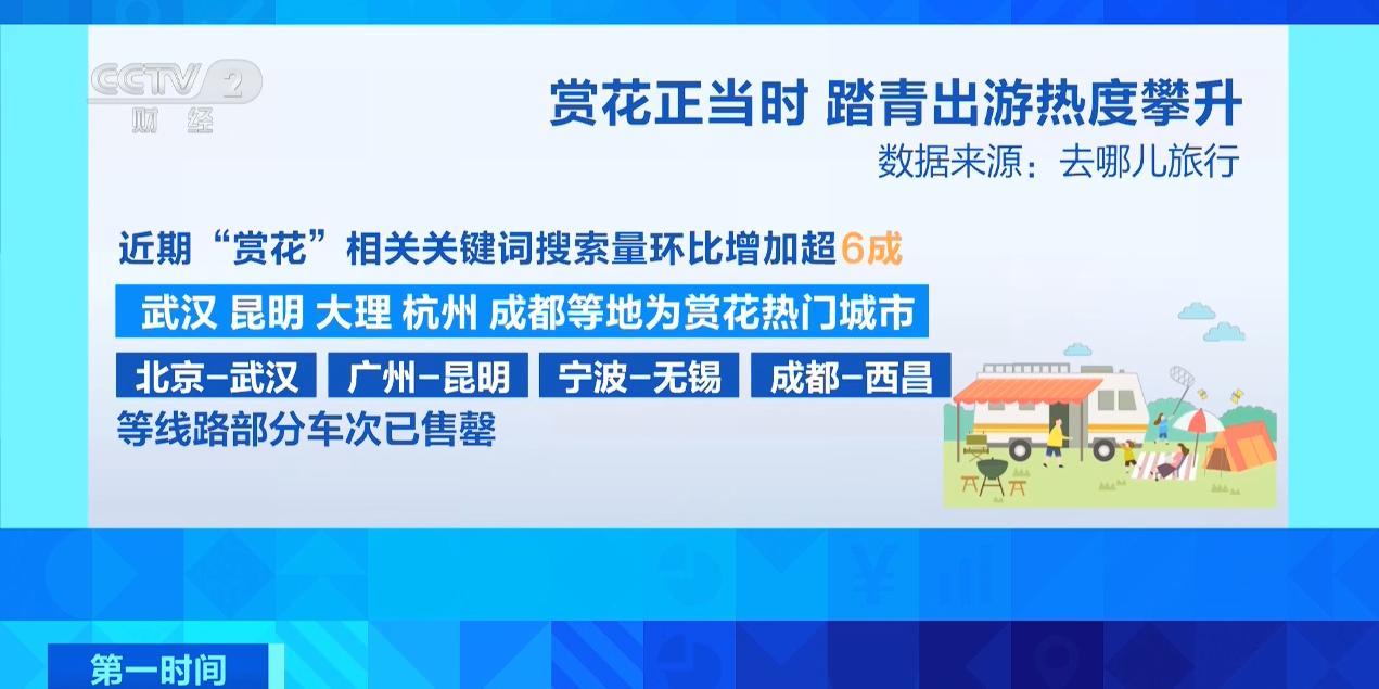 清明假期,踏青出遊熱度不斷攀升,數據顯示,近期“賞花”相關關鍵詞搜索量環比增加超六成。武漢、昆明、大理、杭州、成都等地成爲了賞花熱門城市。目前,北京至武漢、廣州至昆明、寧波至無錫、成都至西昌等線路部分車次已售罄。
