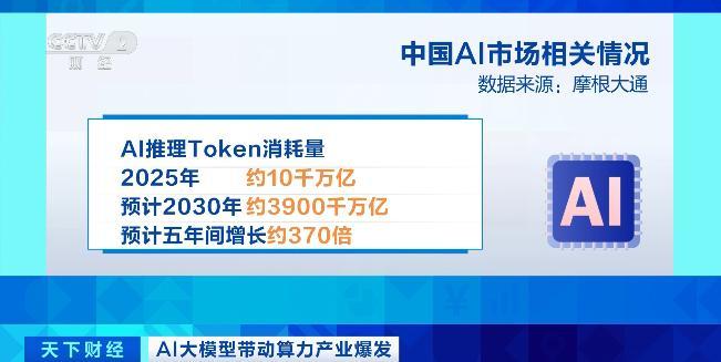 摩根大通預測,中國的AI推理Token消耗量預計將從2025年的約10千萬億增長至2030年的約3900千萬億,五年間增長約370倍。