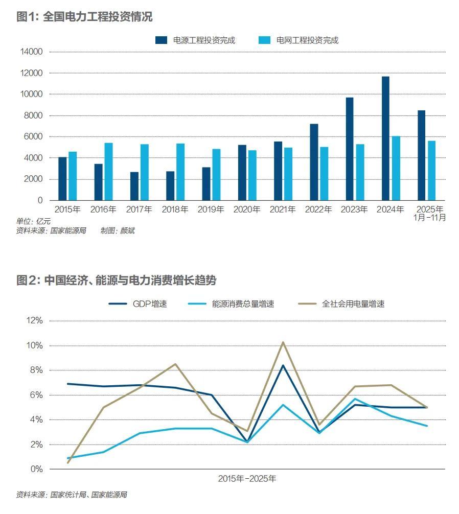 國家能源局數據顯示,十年間,全國電力工程投資額實現了翻倍增長,從“十三五”年均千億級躍升至“十四五”年均萬億級,並有望在“十五五”階段站上2萬億元的新臺階。同時,投資結構不斷調整。2020年起,電源投資超過電網並持續拉大,到2024年電源投資幾乎是電網的兩倍,但2025年又出現了趨勢性變化。展望“十五五”,電力工程投資將更注重整體效能,推動電力系統向“源網荷儲”深度融合。