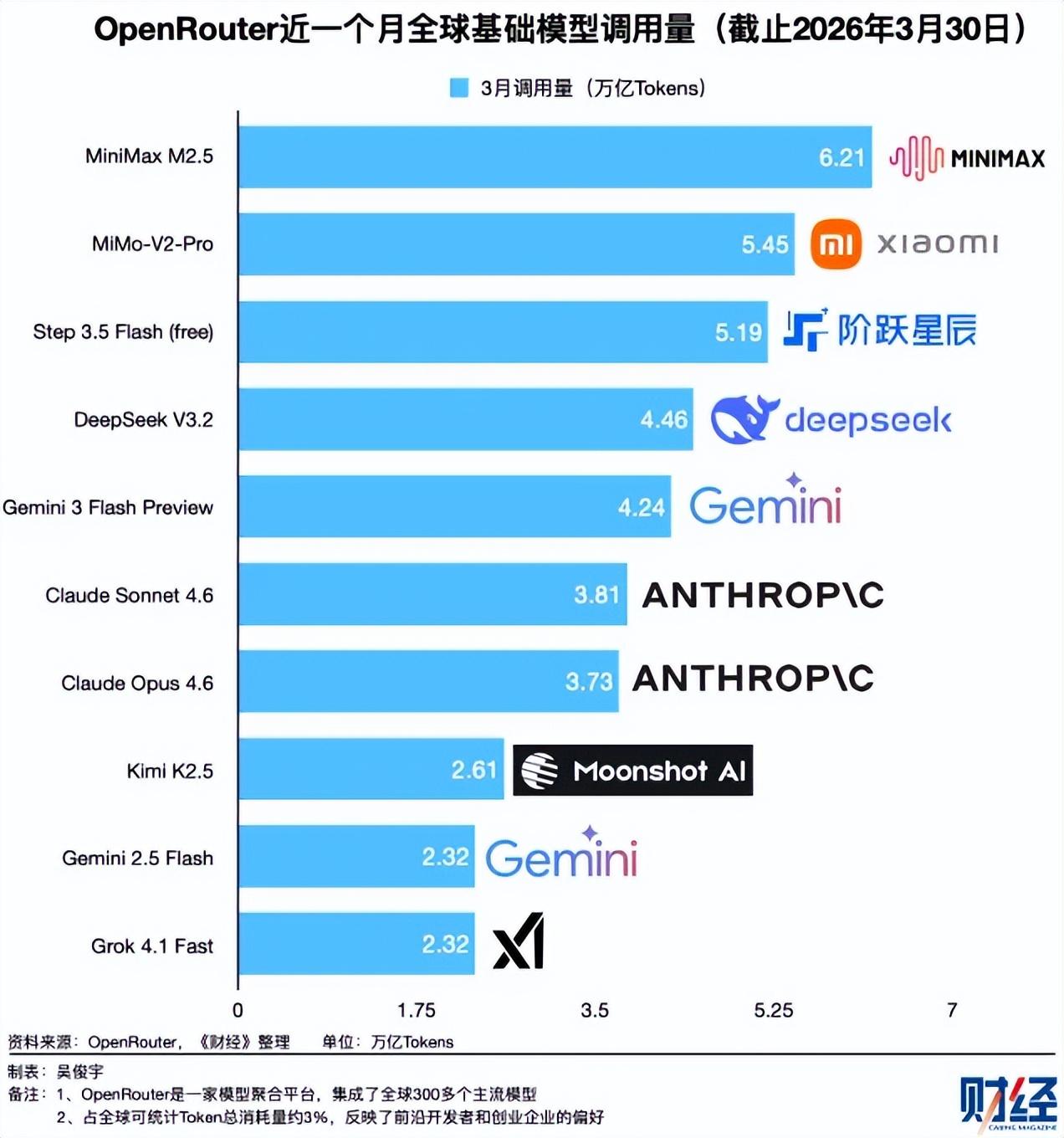 OpenRouter今年3月Token消耗量位居全球前十的模型,有五款來自中國。OpenRouter截至3月30日數據顯示,最近一個月,MiniMax M2.5、小米的MiMo-V2-Pro、階躍星辰的Step 3.5 Flash free(免費版)、DeepSeek V3.2、Kimi K2.5全球Token調用量分別全球第一、第二、第三、第四和第八。