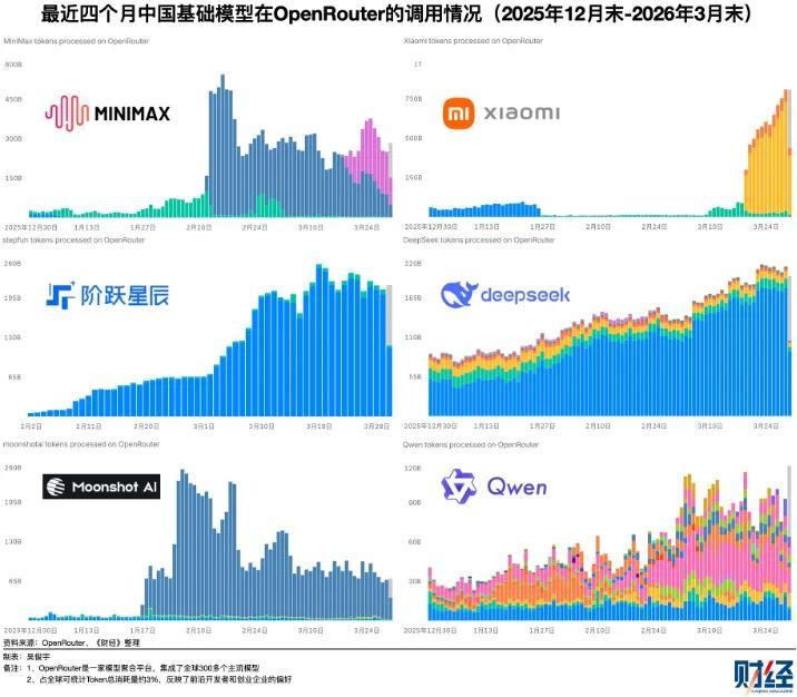 這個趨勢是2026年初開始出現的。中國基礎模型(包括MiniMax、月之暗面、智譜、階躍星辰、DeepSeek、小米、阿里千問)的Token調用量都在大幅增長。