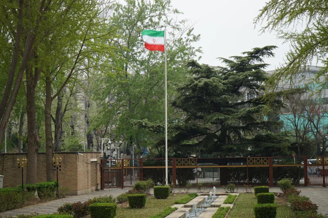 伊朗大使館懸掛的伊朗國旗。攝影/江瑋