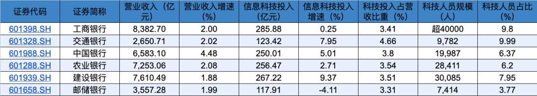 工行科技投入285.88億元,規模持續位居六大行首位;建行科技投入增加逾22億元至267.22億元,增速9.37%,爲六大行中增速最高;交行科技投入營收佔比4.66%,佔比居六大行首位